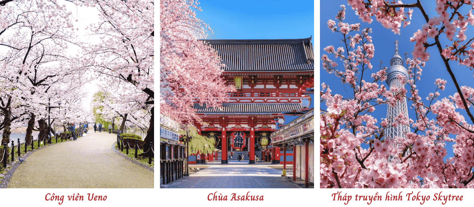 - Ngắm hoa anh đào tại Công viên Ueno (HOẶC Công viên Yoyogi/ Đại lộ Chidorigafuchi /Công viên Inokashira/…): Công viên Ueno – một trong năm công viên công cộng lâu đời nhất Nhật Bản với diện tích hơn 120 hecta. nổi tiếng với 1,000 cây anh đào nở rộ vào giai đoạn cuối tháng 3 đầu tháng 4 được du khách và người dân Tokyo cực kỳ yêu thích; Công viên Yoyogi – là một trong những công viên lớn nhất ở Tokyo với hơn 600 cây hoa anh đào, đây cũng là một địa chỉ hấp dẫn để tổ chức dã ngoại ngắm hoa; Đại lộ Chidorigafuchi – một con hào nước nằm ở phía Tây Bắc Cung Điện Hoàng Gia, có hình dạng độc đáo, cấu trúc trông giống như chim choi choi, trong tiếng Nhật gọi là chidori, là một địa điểm nổi tiếng để ngắm hoa anh đào ở Tokyo. Dọc theo con hào có khoảng 260 cây hoa anh đào xếp 2 bên bờ sông, tạo điểm nhấn đặc biệt cho nơi đây; công viên Inokashira – nổi tiếng với không gian xanh mát và những hàng cây anh đào rực rỡ. Đặc biệt khi mùa xuân đến, nơi đây là điểm đến hấp dẫn cho những ai yêu thích hoa anh đào (tùy tình hình thực tế về tình trạng hoa nở, tình trạng giao thông công ty sẽ linh hoạt đổi điểm ngắm hoa cho quý khách)